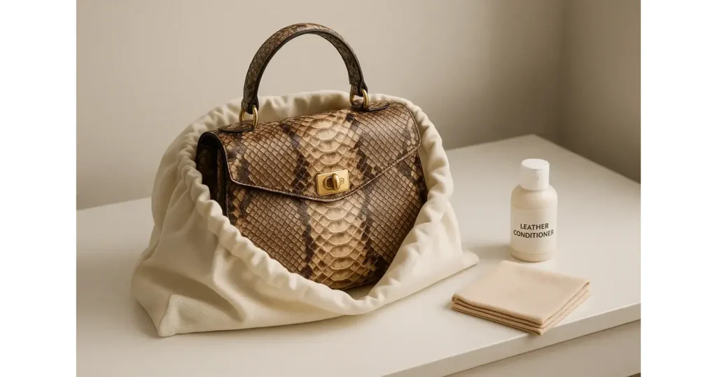 Follow the general care rules above. Use a soft cloth and mild soap or a dedicated exotic leather cleaner. Condition it with a neutral conditioner (free of alcohol) every few months. Store in a dust bag and stuff leather goods to keep shape. Avoid letting the bag sit in the rain, and keep it out of sunlight to prevent fading. My experience: even a single drop of oil-based polish will mar an exotic finish, so use products sparingly and always test first.